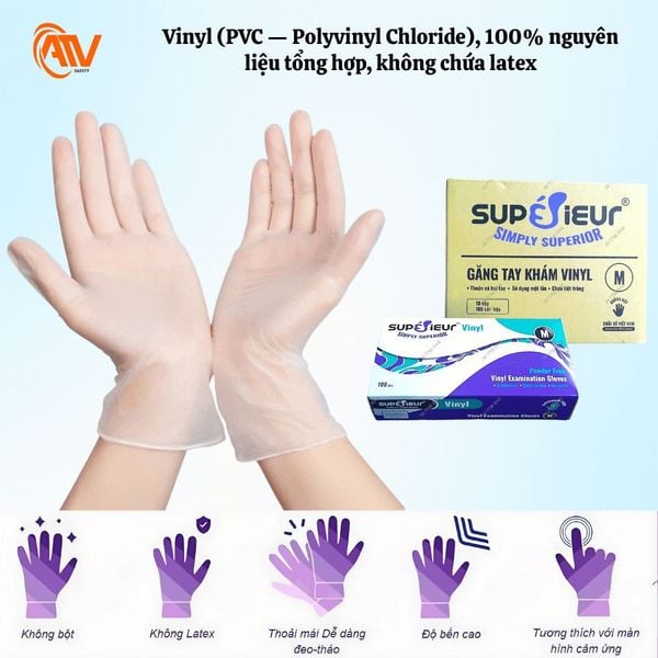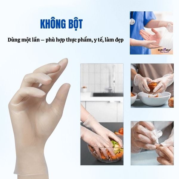 Găng Tay Thực Phẩm Không Bột Vinyl Supérieur chuyên dùng trong y tế, được sử dụng rộng rãi trong công nghiệp chế biến thực phẩm, chế biến thịt, nấu ăn, thuỷ hải sản,... với mục tiêu là để bảo vệ tay trong việc khám chữa bệnh, chăm sóc sức khoẻ, làm đẹp và thực phẩm.