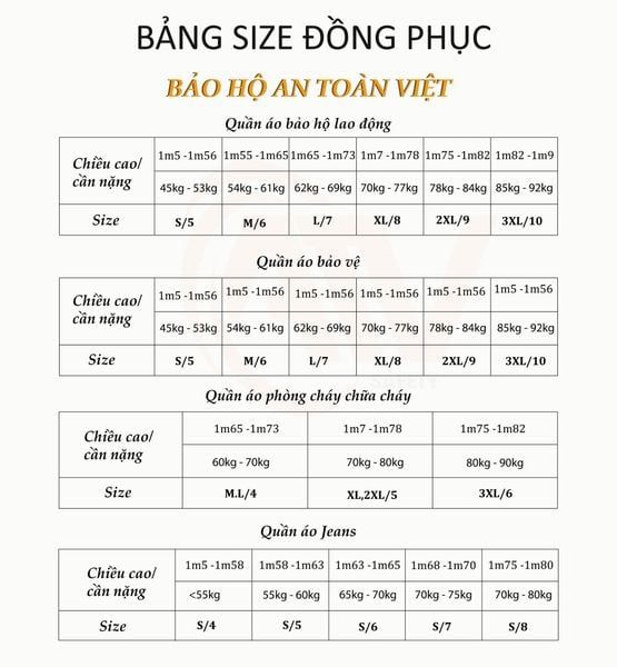 Đây là bảng size quần áo bảo hộ lao động tại An Toàn Việt, giúp bạn lựa chọn kích cỡ phù hợp nhất.